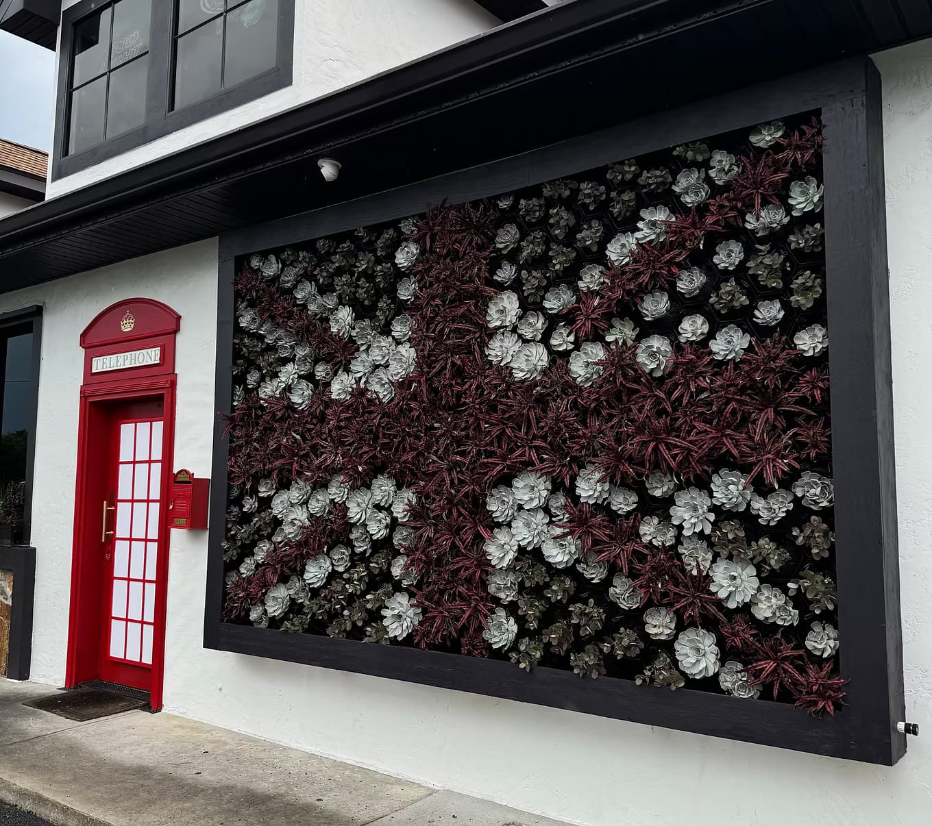 These two walls represent the Union Jack and American flag in a novel fashion using 100% real plants. The 3 varieties used represent species from North America, South America, and Europe. Covering over 200 sq feet of wall space these are the largest exterior living walls in all of the Space Coast. They are also extremely unique in that they provide a to-scale near representation of both flags in design. Designer and Installer Frida’s won the Silver Award for Succulent Walls at the 2025 International Tropical Plant Expo. Plant enthusiasts would have to travel to the Miami or Los Angeles areas to see comparable walls.